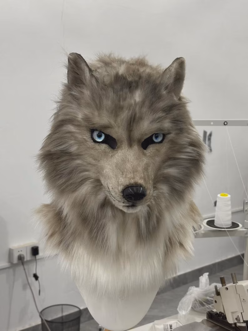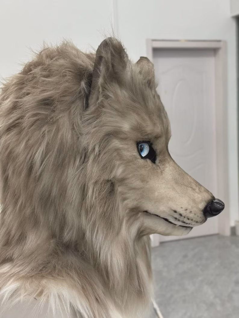 Glacial blue eyes, cool grey ombré fur and a full layered ruff create a striking, camera-ready wolf profile. Sculpted facial planes and subtle airbrushed shading bring depth on stage and in photos—ideal for cosplay, LARP, Halloween, festivals and shoots.